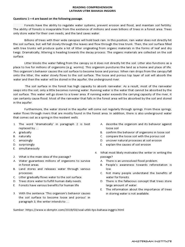 Instead, they develop over time as people go about their daily behaviors, sense people's reactions to those behaviors, and observe what other people are doing. Forests have the ability to regulate water systems, prevent erosion and flood, and maintain soil fertility. Berikut adalah contoh soal bahasa inggris tes potensi skolastik (tps) utbk 2019/20. Soal soal utbk bahasa inggris dan pembahasannya. Subtes bahasa inggris adalah jenis subtes tambahan baru pada tps utbk.