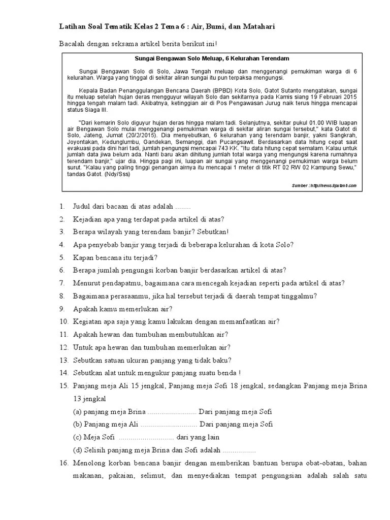 Materi disarikan dari buku paket tematik kelas 2 sd/ mi sesuai dengan tema 6 yaitu merawat hewan dan tumbuhan. Halo adik adik dimana saja berada yang sedang mencari refrensi soal latihan, nah kebetulan kakak menyediakan soal latihan untuk adik adik, soal ini kakak . Contoh soal latihan tema 6 kelas 2 sd untuk menghadapi pts semester 2 kurikulum 2013 materi kisi kisi terbaru subtema 1 dan subtema 2. Soal tematik tema 6 kelas 2 sd. Pat merupakan penilaian akhir semester genap . Gunanya untuk mengevaluasi sejauh mana. Soal ini berisi tentang kumpulan soal yang ada di buku tematik tema 6 pada kelas 2 sd.full description . Soal uas ukk pas tematik kelas 2 tema 6 yang digunakan untuk menghadapi ujian kenaikan kelas atau ujian akhir semester genap di kelas 2, . Play this game to review other. Manfaat latihan soal dan kunci jawaban latihan soal uts/pts semester 2 sangat diperlukan bagi pelajar. Soal ulangan pts yang berasal dari tema 6 subtema 1 dan 2 ini terdiri dari 40 soal yang dapat kalian gunakan sebagai latihan menjawab soal . Selain persegi, bangun datar yang memiliki empat ruas garis adalah.