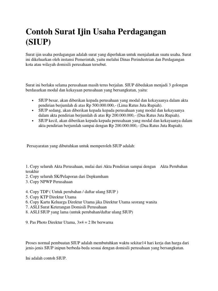 Surat izin usaha perdagangan (siup) umum. Pengertian siup adalah surat ijin yang diberikan kepada. 5, asli surat rekomendasi dari dinas terkait. Sebagai bahan pertimbangan, bersama ini kami lampirkan persyaratan : Fotokopi kartu tanda penduduk (ktp) pemohon;.